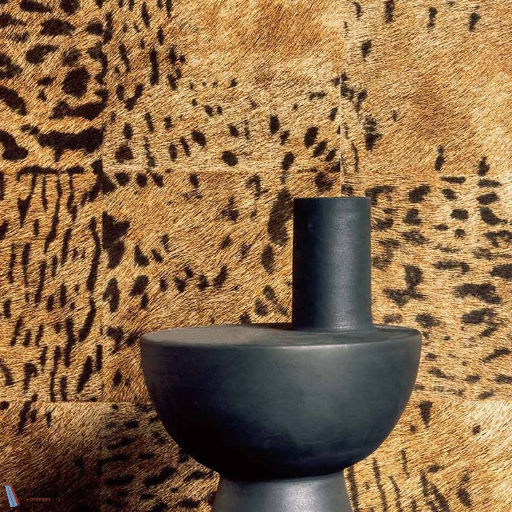 Panthere behang Elitis. Dit behang toont een dierenhuid van een panter met een geometrisch patroon van vlakken. Een sprekend en warm vinyl behang. Behang Panthere Elitis Sauvages behangcollectie.
