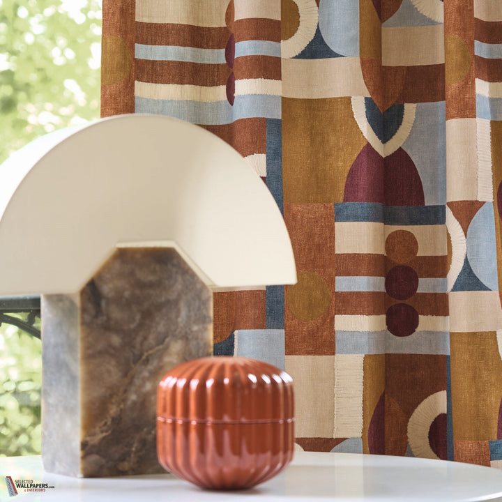 Paro stof Casamance. De stof Paro toont majestueuze landschappen die transformeren tot grafische symbolen. Cirkels, halve cirkels, lijnen en rechthoeken. Digitaal bedrukt. Stof Paro Casamance Manali Collectie.