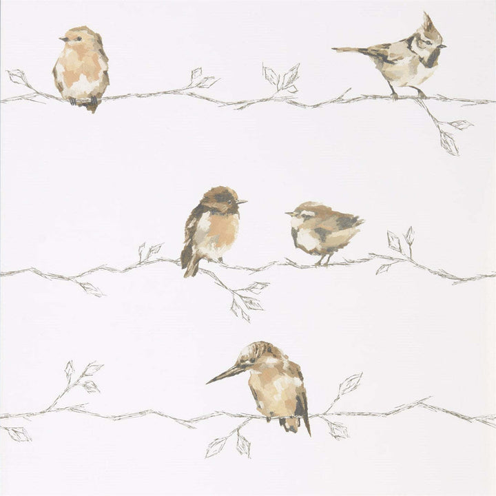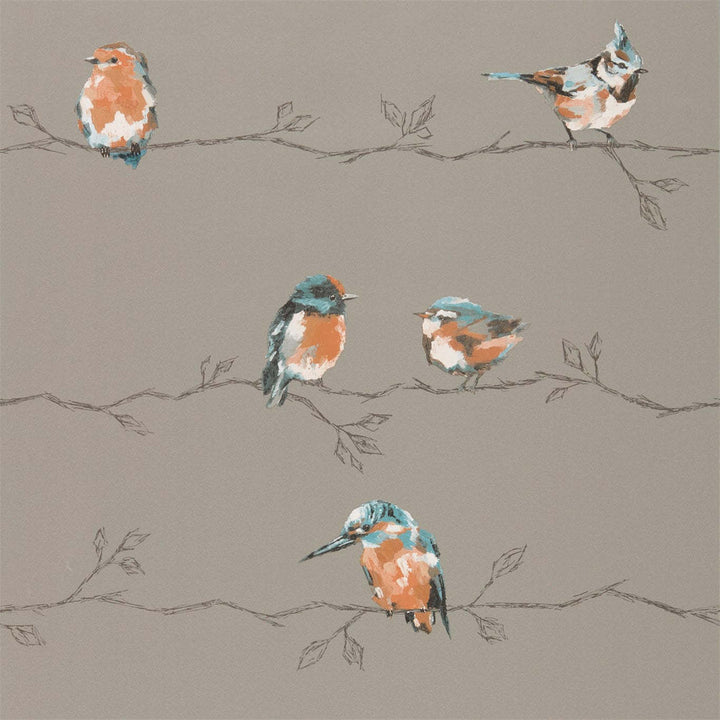 Persico behang Harlequin. Betoverende Britse vogels in al hun schoonheid zitten op willekeurige intervallen op dit behangontwerp, diepdruk gedrukt op breed papier. Behang Persico Harlequin Standin Ovation collectie.