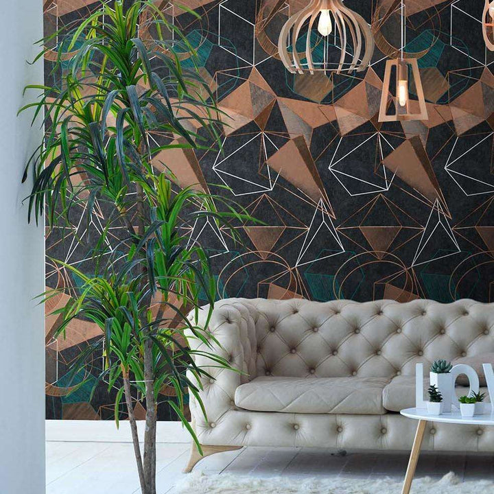 Perspectives behang van Mind the Gap. Dit behang is als een prachtig kunstwerk. Het intrigeert en het boeit door zijn geometrie en prachtige kleurstelling, dit behang wordt nooit saai.