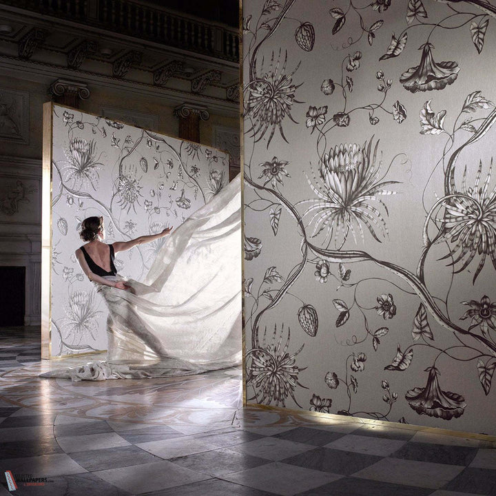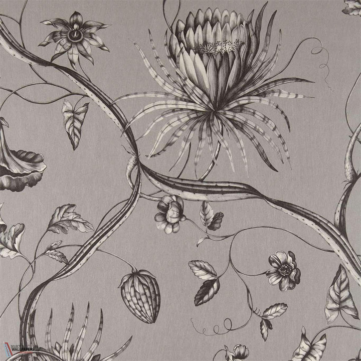 Phaedra behang Zoffany. Dit behang bevat elegante, gewelfde bloemen, bladeren en ranken lopen losjes over dit royaal uit elkaar geplaatste behangpatroon, geïnspireerd door een Engelse toile uit de 18e eeuw. Gedetailleerde botanische tekeningen staan op een effen achtergrond gedrukt in verfijnde kleuren. Behang Pheadra Zoffany Cotswold Manor collectie.