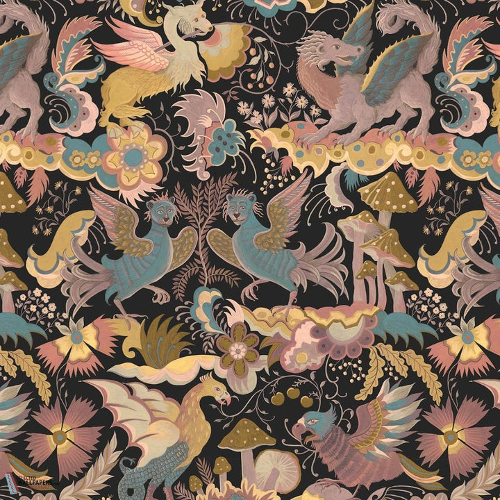 Phantasia behang House of Hackney. Dit behang toont een oosters motief van draken en andere gevleugelde beesten tussen de wolken, bloemen en paddenstoelen. Inspiratie kwam uit het magische land Trematonia.. Behang Phantasia House of Hackney