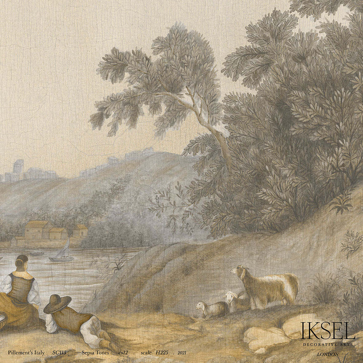 Pillement's Italy behang Iksel. Dit landschap behang is ontwikkeld vanuit het minder bekende aspect van Pillement. De beroemde Franse kunstenaar is vooral bekend om zijn decoratieve werk. Perfect ontwerp voor grote kamers.