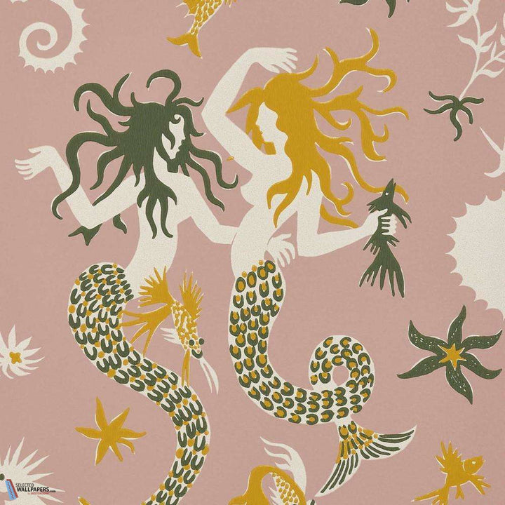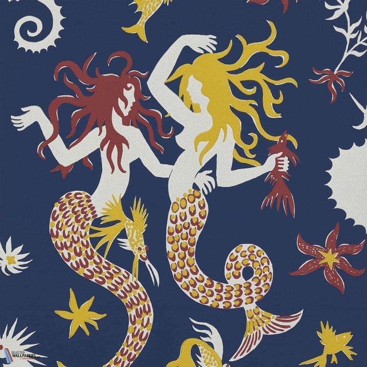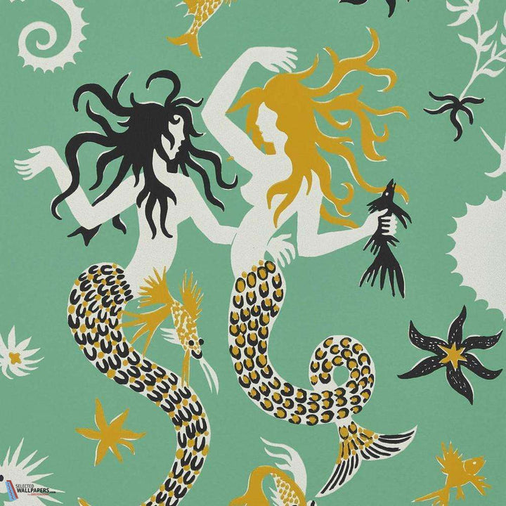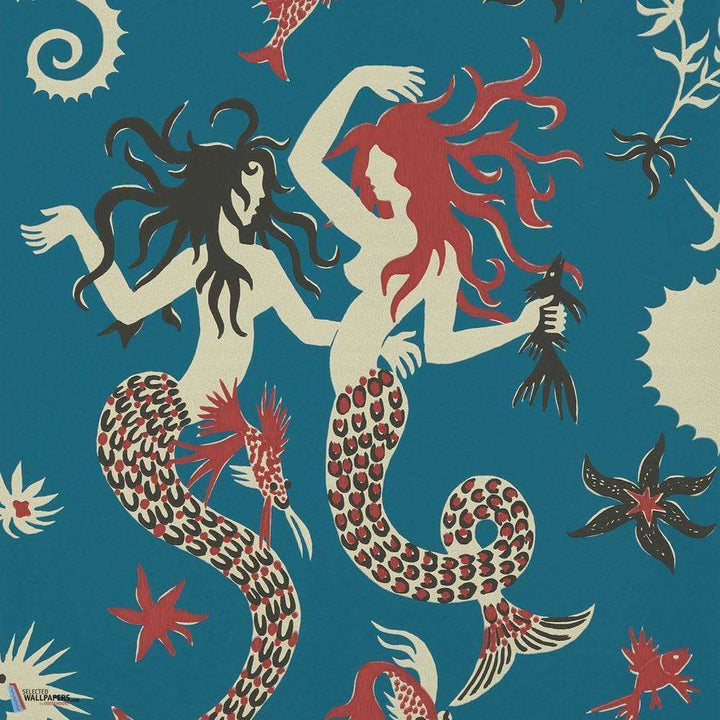 Poseidon behang van Pierre Frey. Het behang heeft een ontwerp met zeemeerminnen en illustreert op geheel eigen wijze de onderwaterwereld. Het behang heeft een handgeschilderd effect en is een reproductie van een textiel ontwerp uit 1945.