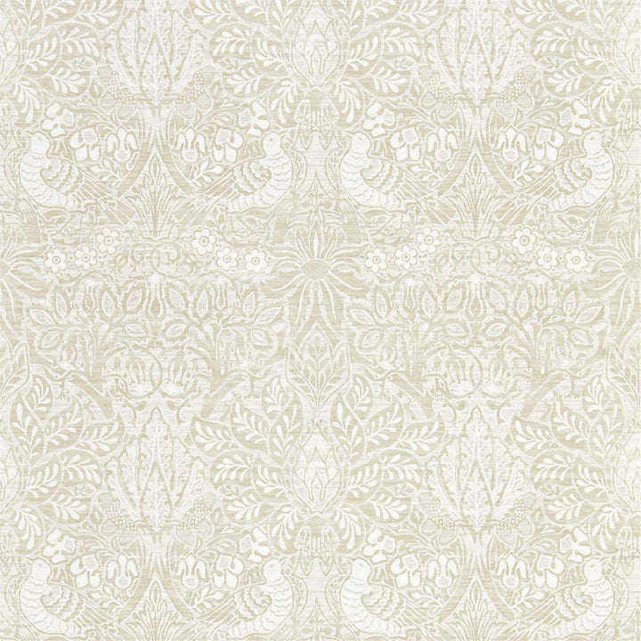 Pure Dove & Rose behang van Morris & Co. Dit ontwerp is een nauwkeurige interpretatie van een geweven stof uit 1897 en is voor het eerst geproduceerd als behang met diepdruk, waarbij de accentkleuren door het inslaggaren zouden zijn geproduceerd om een zacht ombré-effect te creëren. Combineer een van de neutrale kleuren met steen-, hout- en granietafwerkingen.