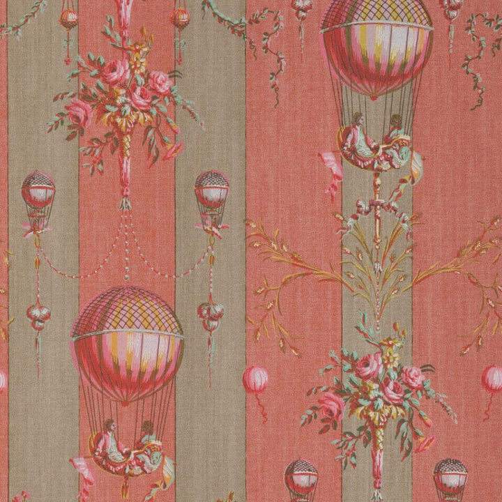 Roziere Fond Gisors behang Braquenie. Een streep behang met een heteluchtballonmotief dat kenmerkend is voor de "ballonmanie" die door de decoratieve kunsten vloog na de eerste vluchten van de gebroeders Montgolfier in 1783.