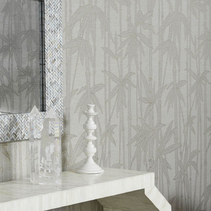 Sagano behang Noblis. Dit behang heeft een grootschalig bamboe plantageontwerp gemaakt van katoen en raffia. Sagano komt in 3 natuurlijke kleuren en 3 kostbare en Japans geïnspireerde tonen. Behang Sagano Nobilis Archipelago collectie.