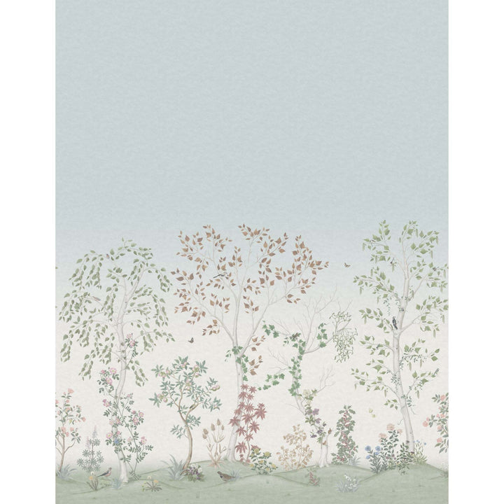 Seasonal Woods behang Cole and Son. Dit behang toont een natuurlijk landschap in al zijn schoonheid. Zacht en met de handgeschilderd. Een groots panoramisch decor. Behang Seasonal Woods Cole and Son The Gardens collectie.