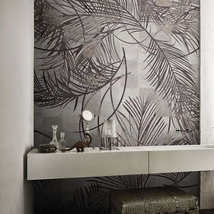 Soulmate behang van LondonArt. Dit badkamer behang heeft een ontwerp met artistieke palm bladeren. Een natuurlijke en rustgevende uitstraling.