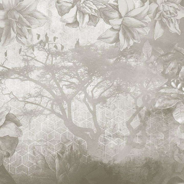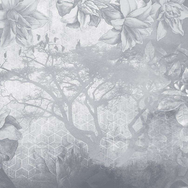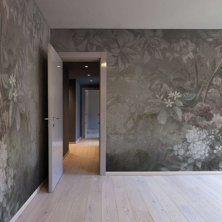 Spirits behang op maat van Muance. Dit behang is een tropische mural vol bloemen, bladeren en takken. Een prachtige diepte wordt gecreeert met de bomen in de achtergrond.