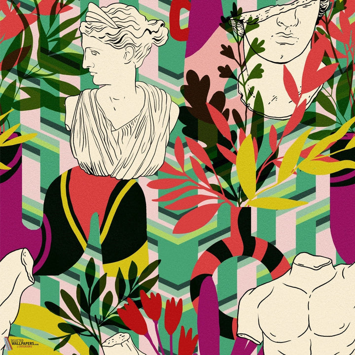 Statuario behang Mind the Gap. Dit behang toont oude beelden tegen een levendige achtergrond van bloemen. De gebeeldhouwde vormen op een abstracte geometrisch achtergrond zorgen voor een prachtig evenwicht.. Behang Statuario Mind the Gap La Dolce Vita behangcollectie.