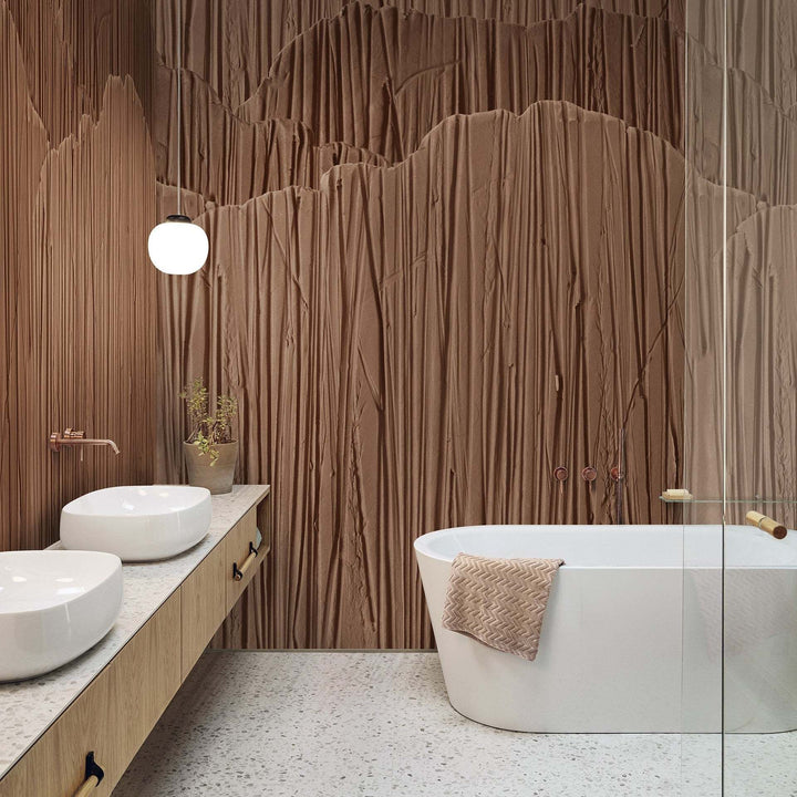 Steli behang van Wall & Deco. Dit behang toont prachtige bergen op geheel eigen wijze. Maak van jouw douche een echte eyecatcher! Badkamer behang Steli Wall & Deco.