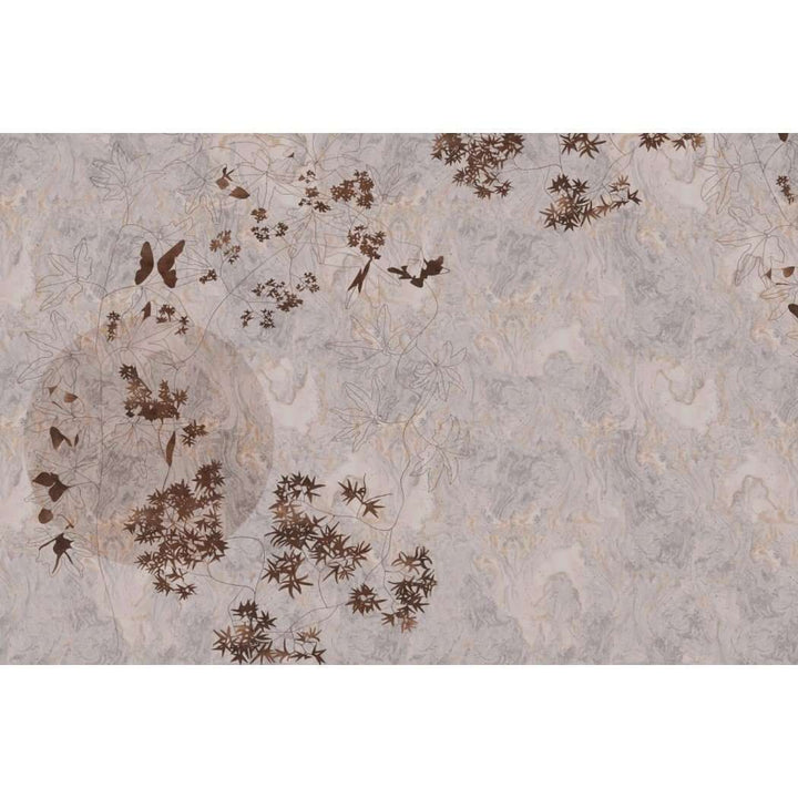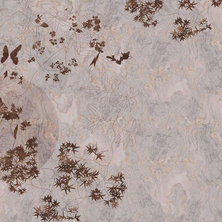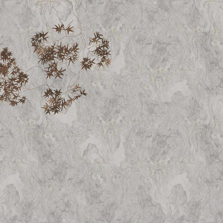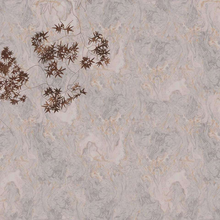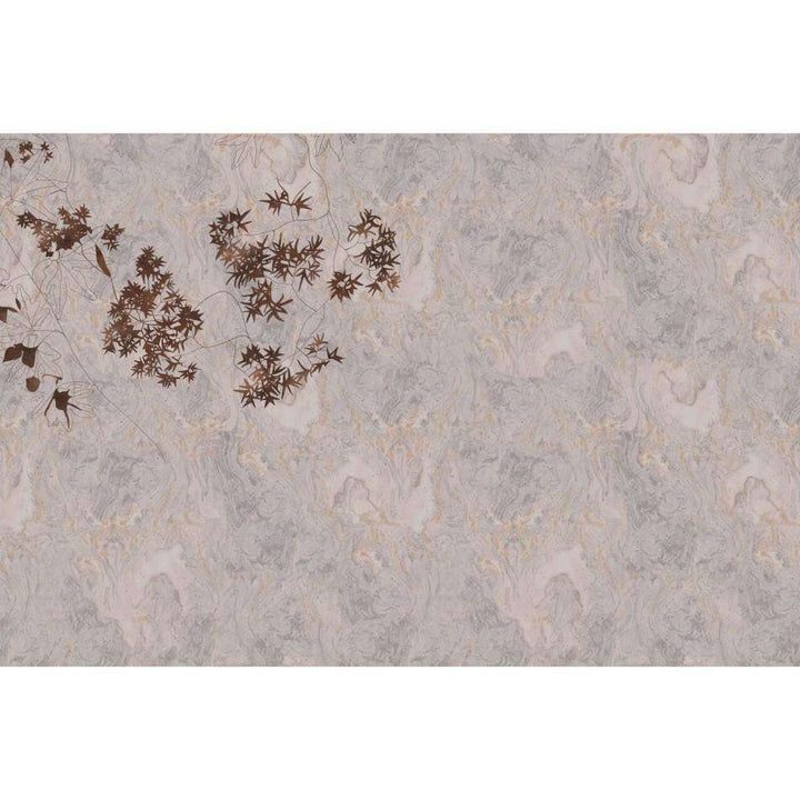 Suiseki behang van Glamora. Dit behang heeft een Oosterse uitstraling met bladeren die zich over de wand bewegen. Een achtergrond die doet denken aan marmer geeft het ontwerp een natuurlijke en rustgevende uitstraling.