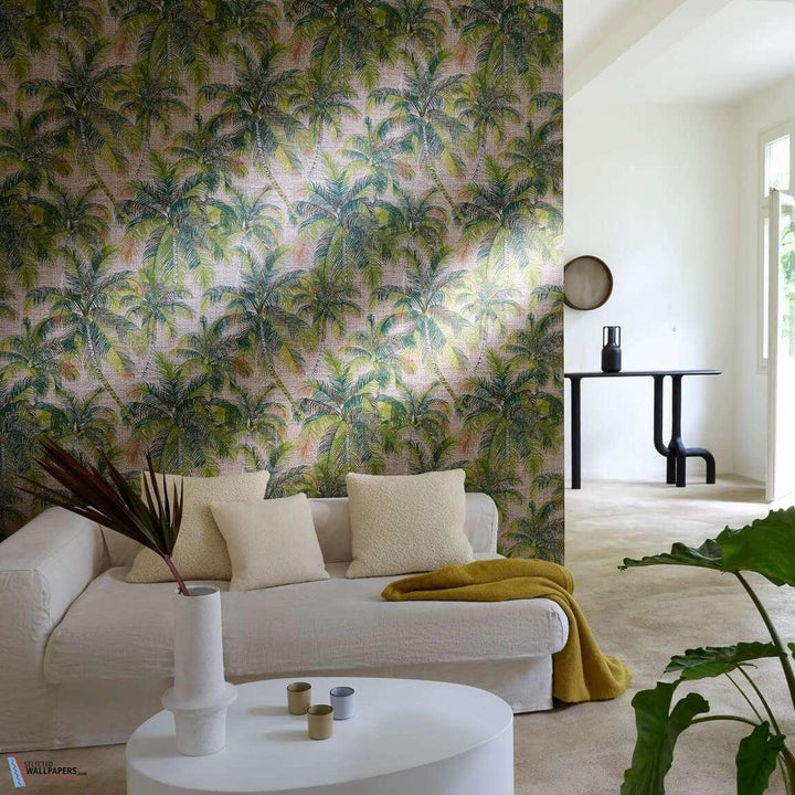 Tampa behang van Pierre Frey. Op dit bhang dansen de groene palmbomen uit Tampa op de muur. Het behang is gedrukt op reliëf vinyl met een gevlochten ambachtelijke uitstraling en heeft een matte of iriserende afwerking.