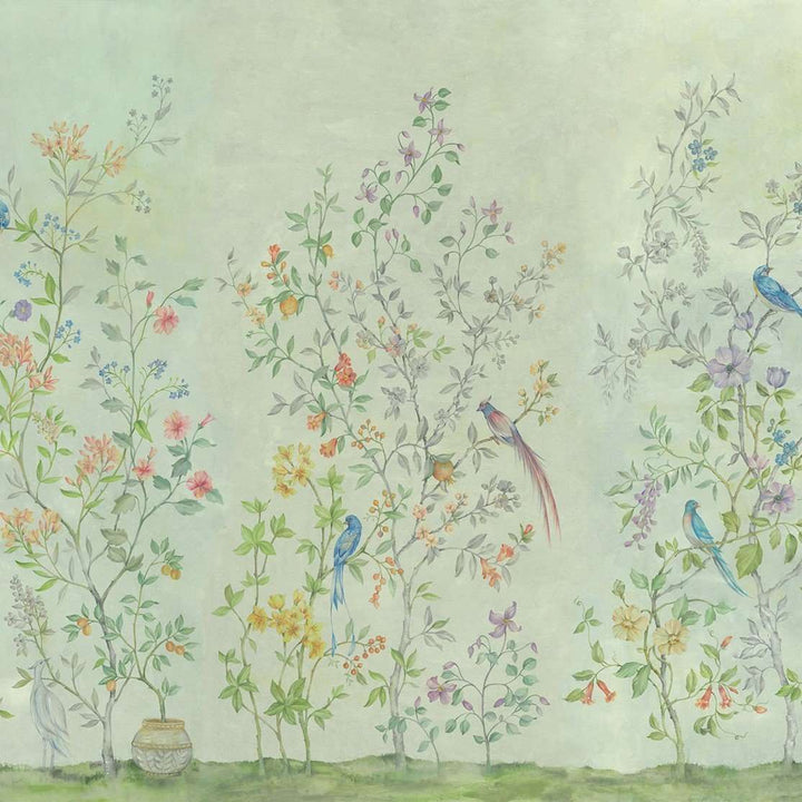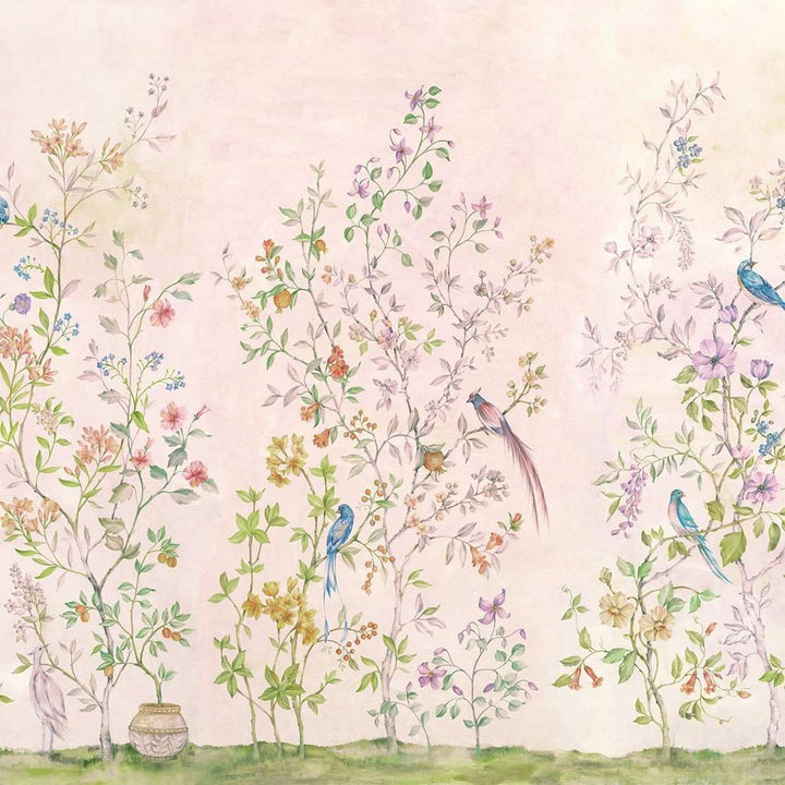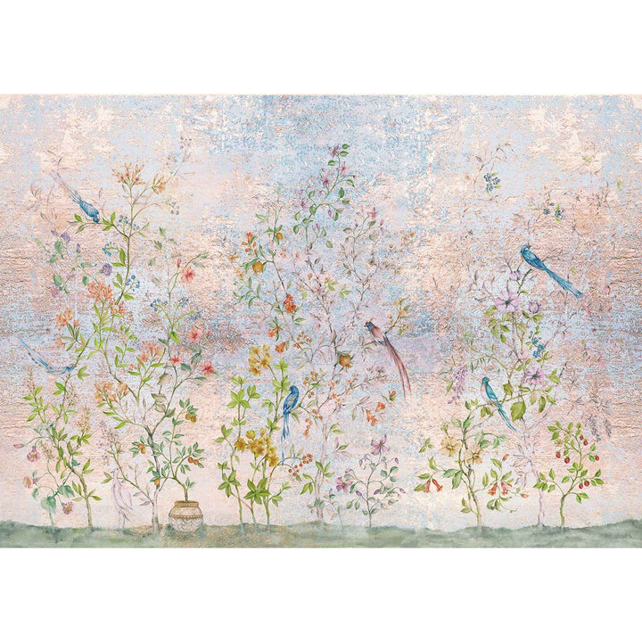 Tea garden behang van Coordonne. Dit luxe behang heeft een romantische uitstraling, vol flora en sierlijke vogels. Een prachtig behang op maat voor bijvoorbeeld een slaapkamer. Behang Tea Garden Coordonne Metamorphosis collectie.
