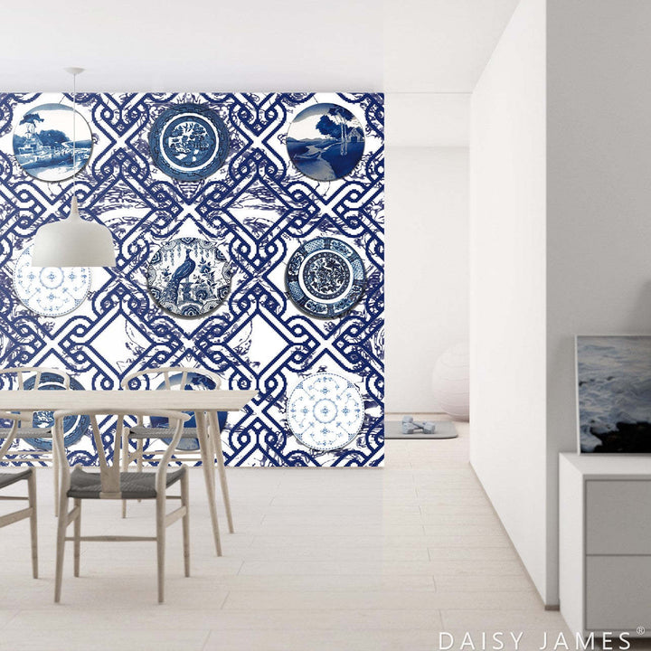 The Blue Delft exclusief behang van Daisy James. Dit behang is als een kunstwerk aan de wand, vol met Delfts blauw. Dit behang wordt op maat gemaakt.