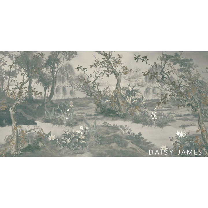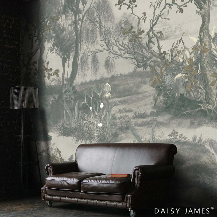 The Gobelin exclusief behang van Daisy James. Dit behang is een ontwerp met een natuurlijke panorama, vol diepte, takken en gebladerte, prachtig! Dit behang wordt op maat gemaakt.