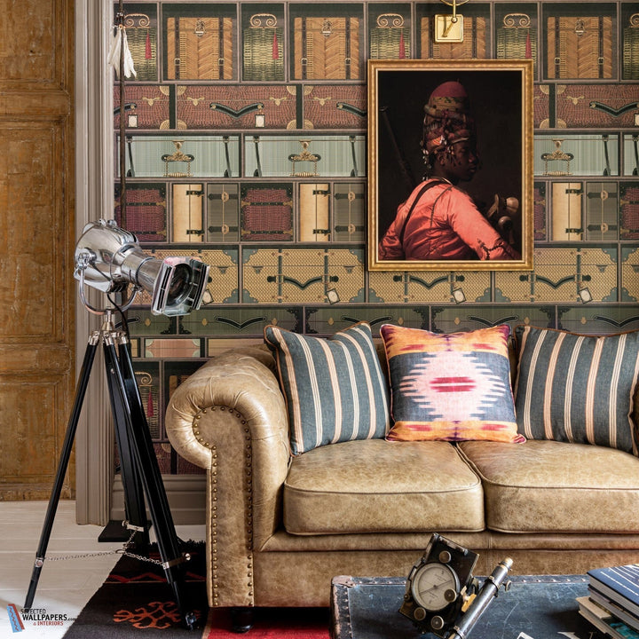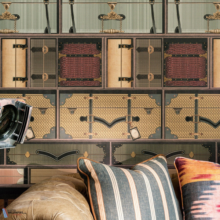 The Luggage Car behang Mind the Gap. Dit behang toont de elegantie van leren koffers in het bagagerek van de trein. Behang The Luggage Car Orient Express collectie Mind the Gap.
