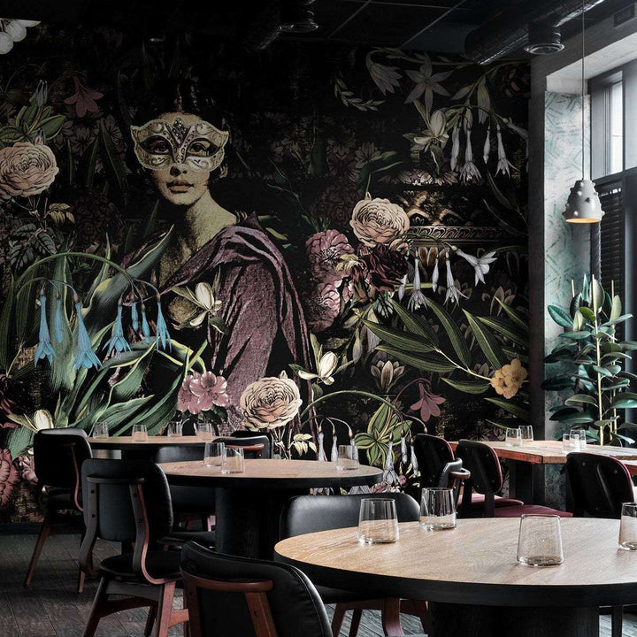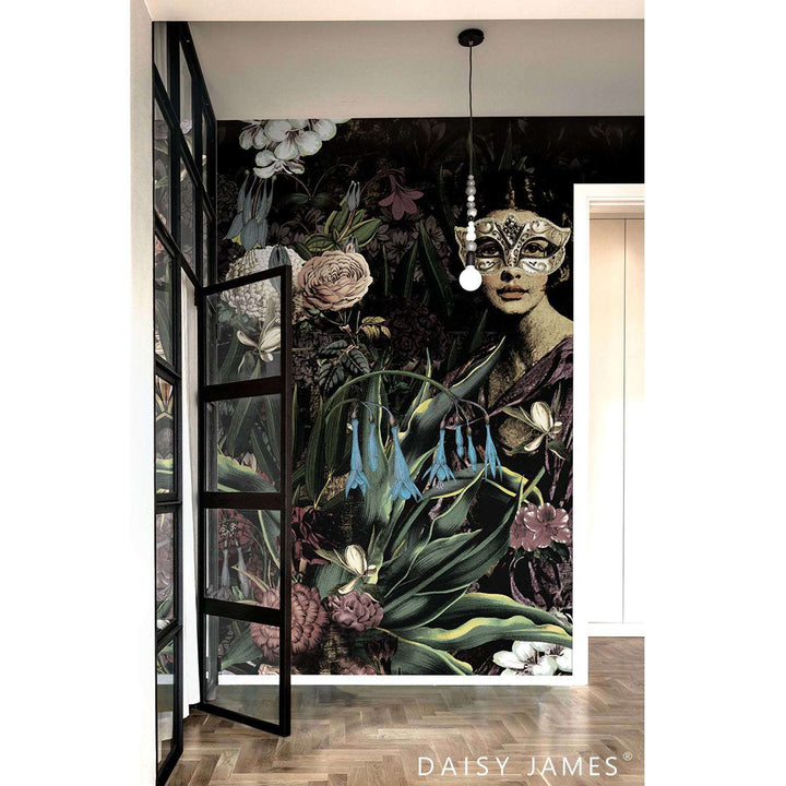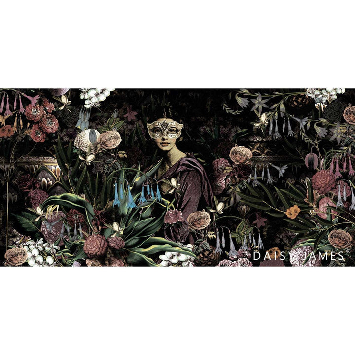 The Mask behang van Daisy James. Dit behang zit vol dramatische en weelderige bloemen en onthult een vrouw verscholen achter een decoratief masker. Een sfeervolle eyecatcher. Behang op maat van Daisy James, verkrijgbaar op Vinyl, of volledig naadloos op Naadloos Vinyl of Pro Textile.