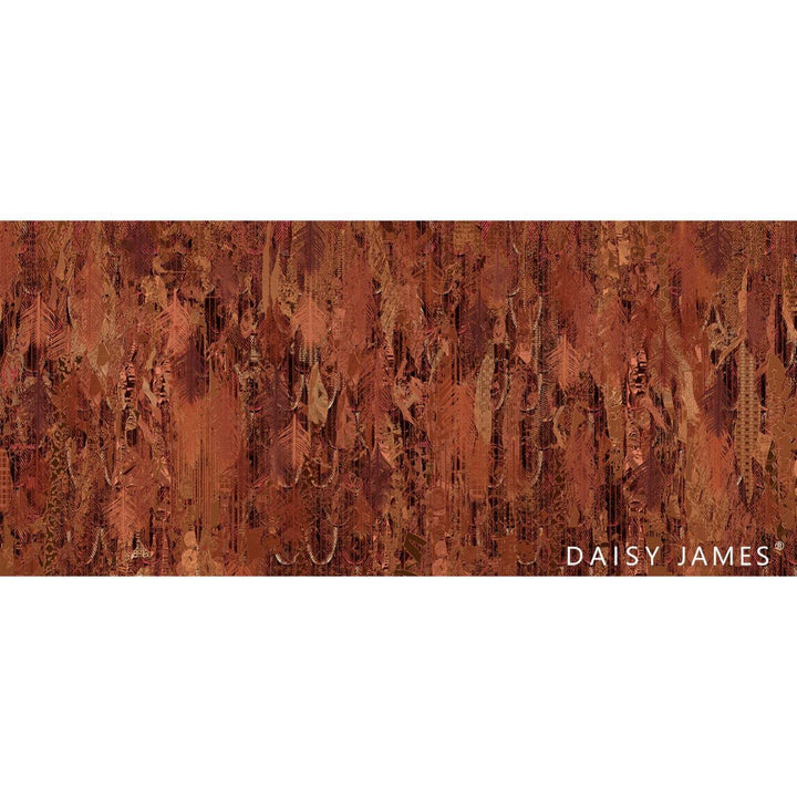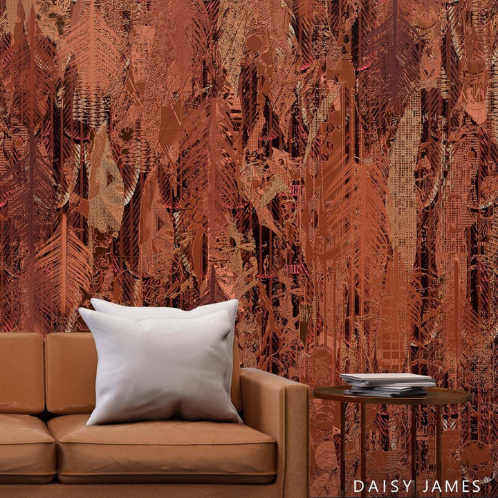 The Panache exclusief behang van Daisy James. Een behang vol oude veren op een kunstzinnige manier weergegeven in oranje bruin tinten. Als kunst aan de muur! Dit behang wordt op maat.