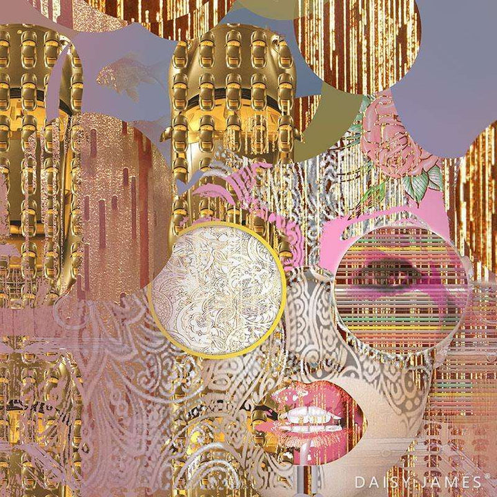 The Pink Lady exclusief behang van Daisy James. Dit behang is als een kunstwerk aan de wand, goud, roze. Dit behang wordt op maat gemaakt.