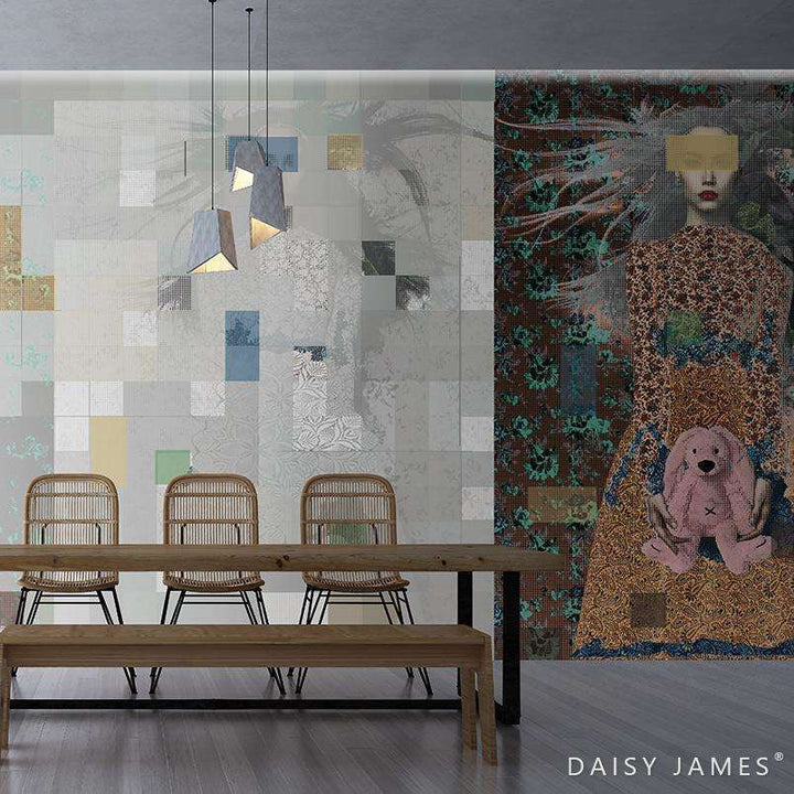 The Pink Rabbit exclusief behang van Daisy James. Dit behang speelt met patronen en afbeeldingen. Speelse vierkanten in middels vierkanten. Dit behang wordt op maat gemaakt.