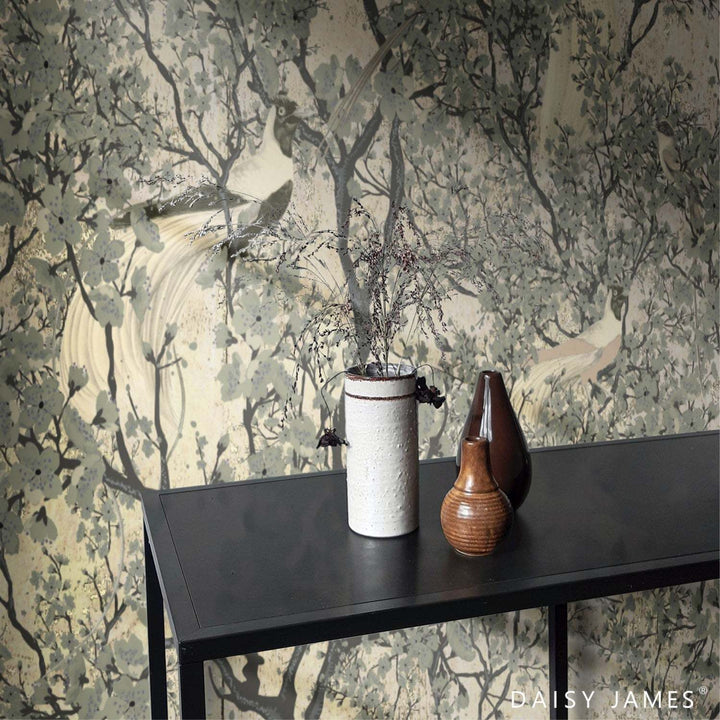 The Song behang van Daisy James. Dit behang is een botanische print met elegante takken, bladeren en rijke vogels die zich hierin bevinden. Geef een klassieke touch aan je eigentijdse ruimte met dit sfeervolle behang.