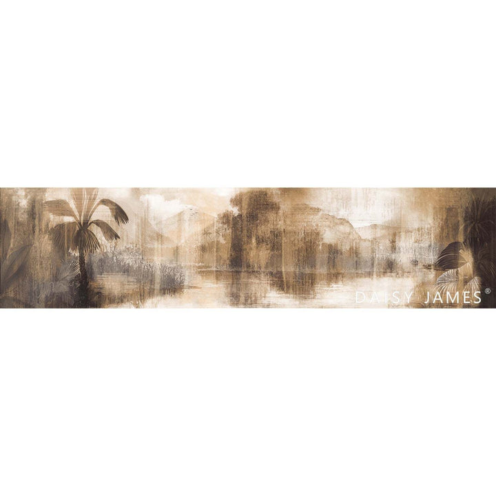The Valley behang van Daisy James. Dit behang is een fantastische panorama van een bergenlandschap langs een rivier. In natuurlijke kleuren creëert het beeld rust, diepte en blijf je ernaar kijken!
