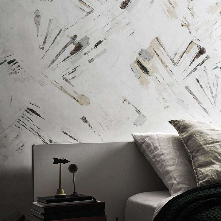 Theorem behang van LondonArt wallpaper. Dit behang is artistiek, penseelstreken met een geometrische regelmaat. Kunstzinnig en sfeervol.