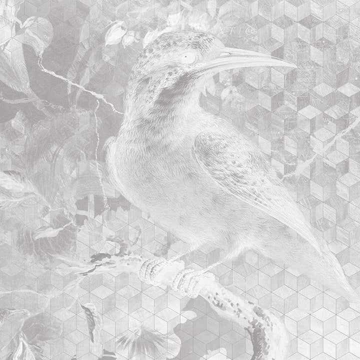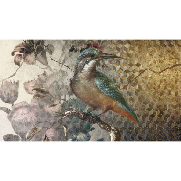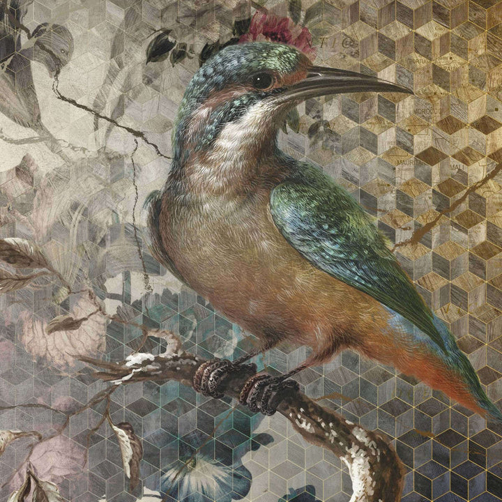 Tomorrow behang op maat van Muance. In dit behang staat een ijsvogel centraal, daaromheen sierlijke bloemen en zeshoeken die een optische diepte geven met een hout structuur.
