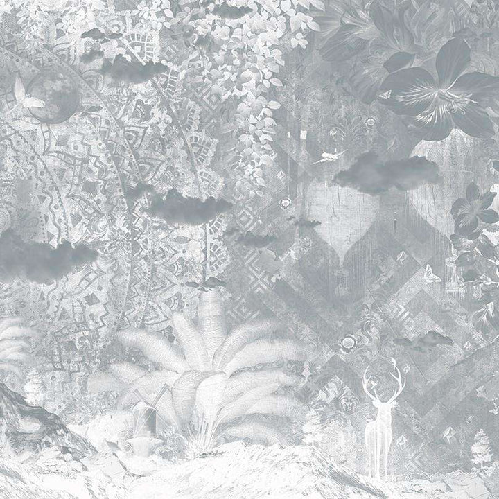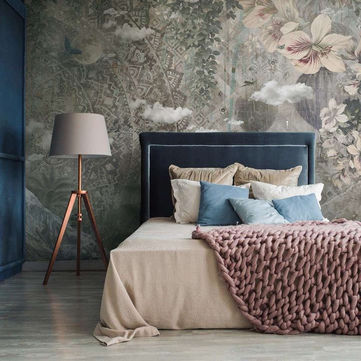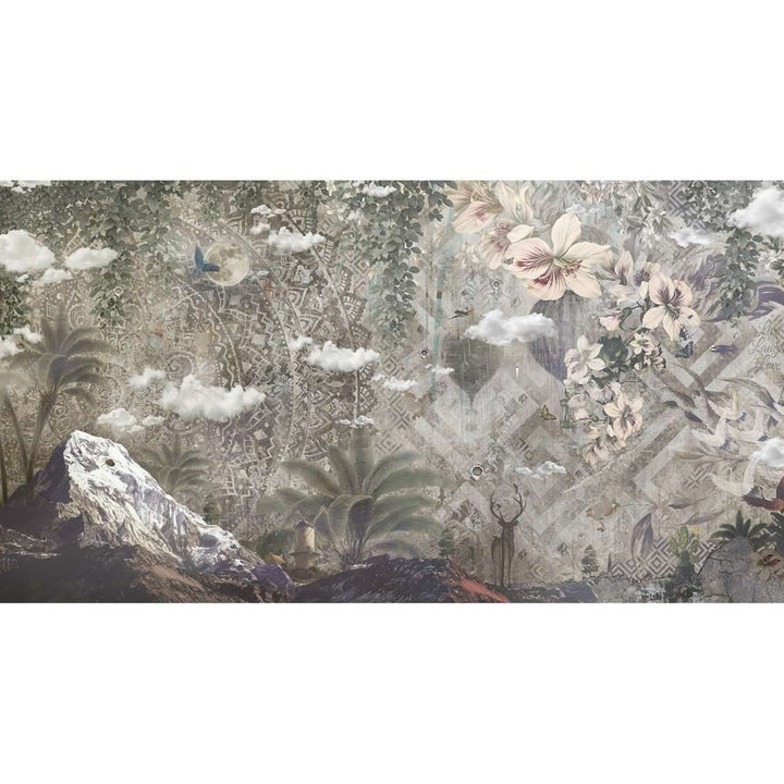 Unspoken behang op maat van Muance. Dit behang blijf je naar kijken! Een panoramisch effect met bergen, palmen en vol bloemen en grafische elementen. Een kunstwerk aan de wand.