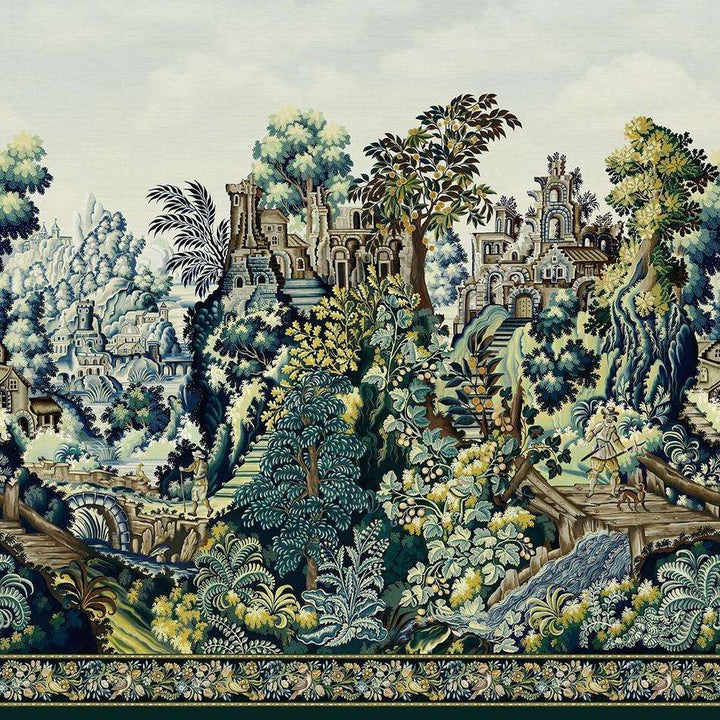 Verdure Tapestry behang van Cole and Son. Dit heeft een schilderachtige scene en is een eerbetoon aan rijk geweven wandtapijten. Een weelderige paneelscene vol leven met zijn overvloed aan rijke flora en fauna.