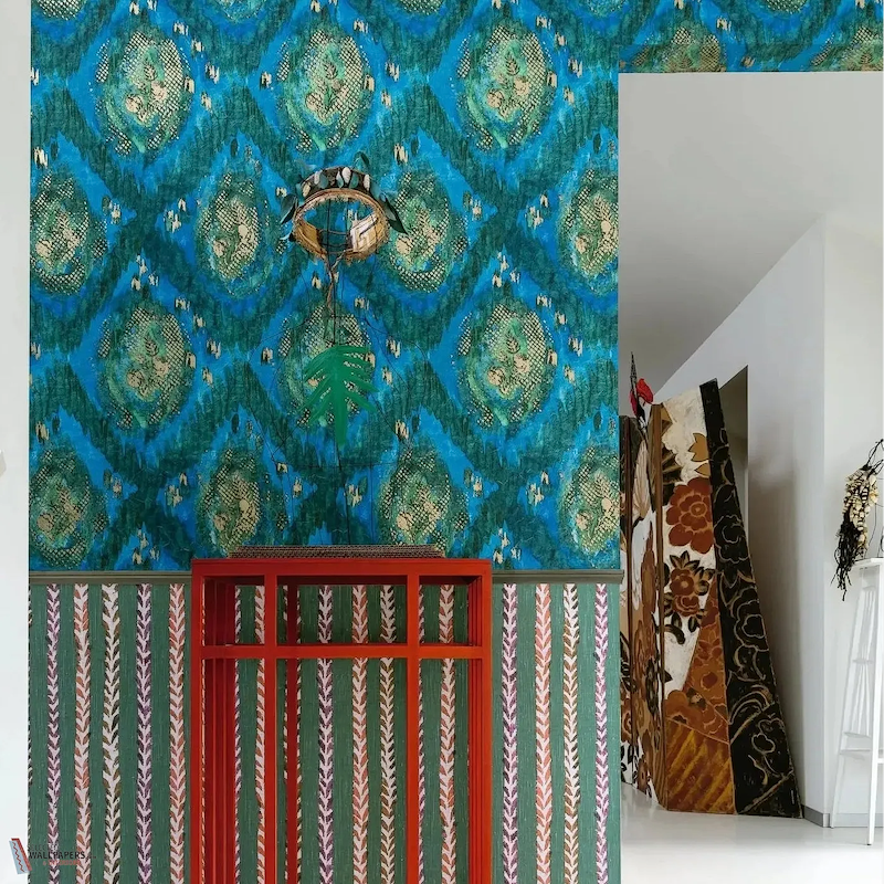 Het Viva La Vida behang brengt de traditionele ikattechniek naar een moderne context. De vervagde, aquarelachtige randen geven het patroon een zachte, organische dynamiek die perfect past in zowel klassieke als eigentijdse interieurs. De gouden accenten tekenen zich af als delicate highlights binnen de medaillons en voegen een edele dimensie toe. Dit behang transformeert een wand tot een artistiek statement, ideaal voor woonkamers, slaapkamers of een verfijnde werkkamer.