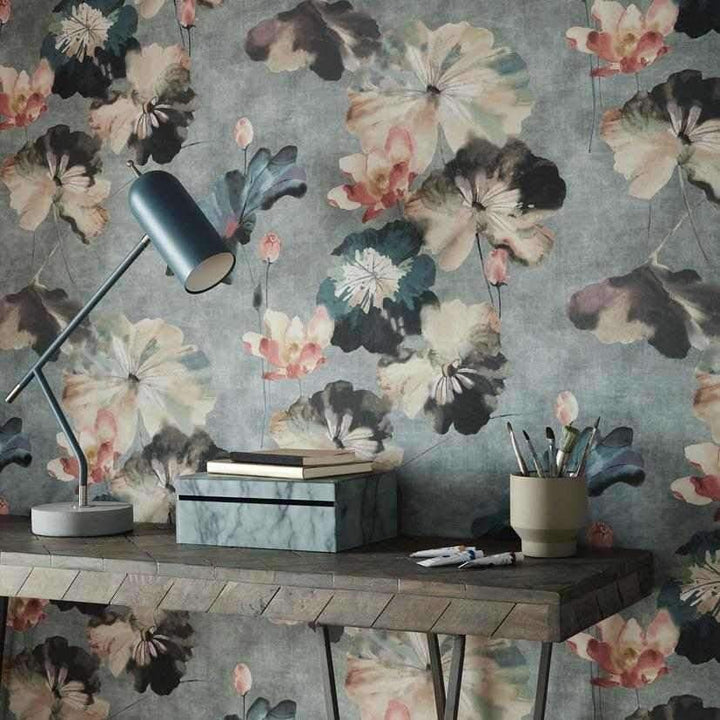 Water Lilies behang van 1838 wallcoverings. Dit behang is versierd met aquatische inktzwarte water lelie bloemen in graderende aquareltinten. Het geeft een sierlijke toets aan dit dramatische bladbloem. In adembenemend zwartbruin grasdoek, of op luxe non-woven.