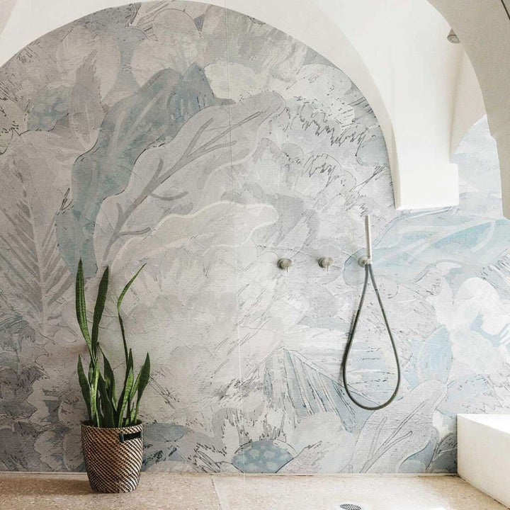 Welcome Back behang van LondonArt. Dit badkamer behang heeft een ontwerp met aquarel bladeren. Een natuurlijke en rustgevende uitstraling.