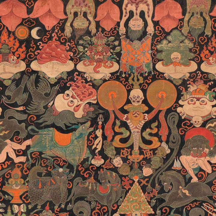 Yama Dharmaraja behang van Mind the Gap. Dit behang heeft een patroon geïnspireerd op de Tibetaanse cultuur. Yama een belangrijke beschermer in het boeddhisme is hier afgebeld met goden en mystieke dieren.