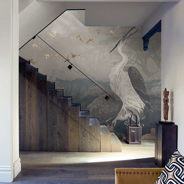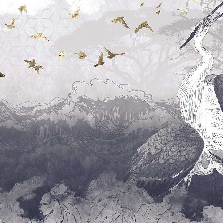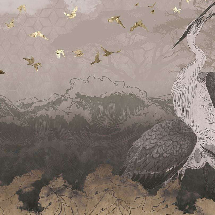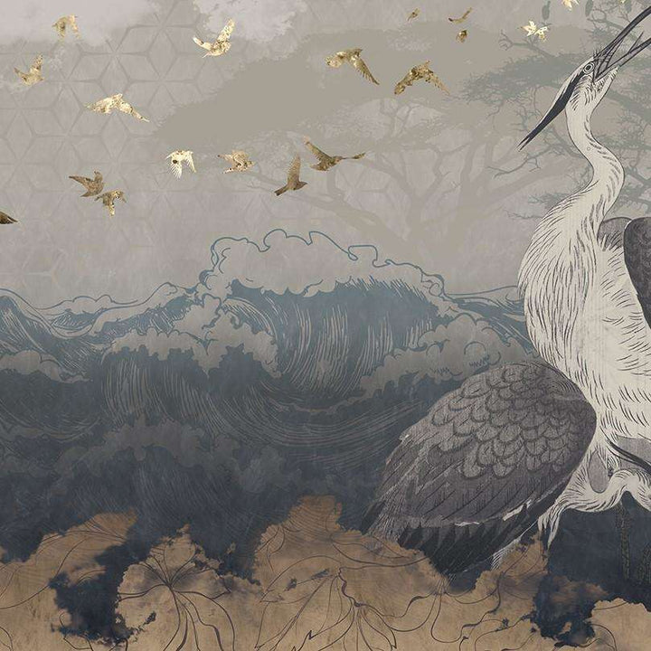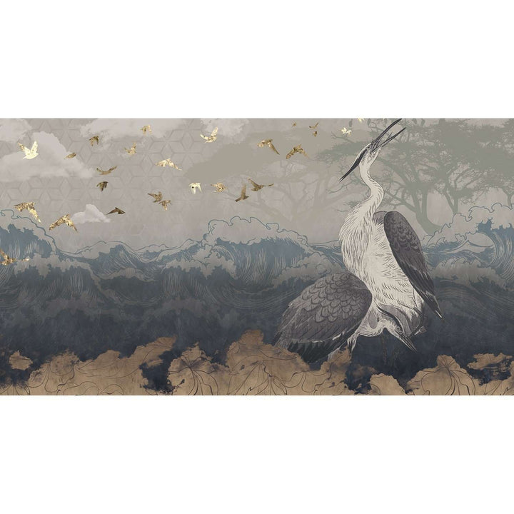 Yanya behang op maat van Muance. Dit behang een blik langs een woeste waterkant waar reigers op zoek zijn naar hun prooi. Een mooi 3d effect met in de lucht gouden vogels. Een natuurlijke panorama.
