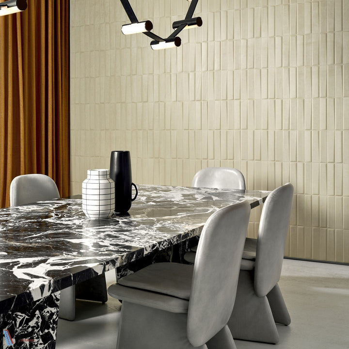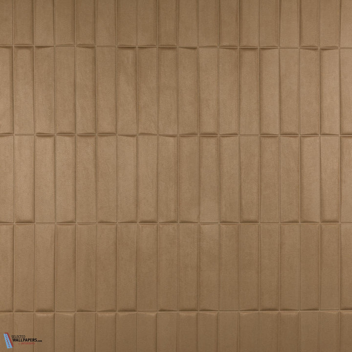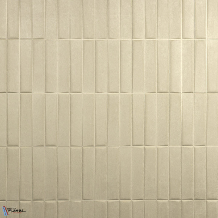 Yugen behang Arte. Dit behang toont verticale smalle rechthoeken met een ongelijk reliëf dat zorgt voor een sprekend 3d effect. Metrotegeltjes met een verleidelijke suède look. Behang Yugen Arte Kanso behangcollectie.