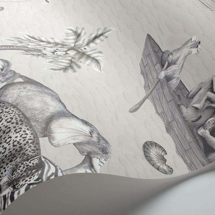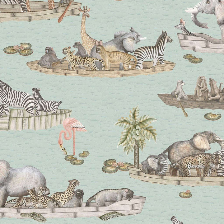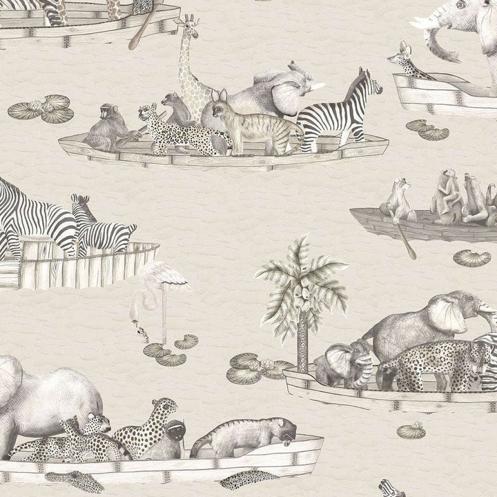 Zambezi behang van Cole and Son. Het behang beschikt over een vloot van boten, met zacht gekleurde zebra's, olifanten, hyena's, occasionele krokodil en hooghartige flamingo's. Het ontwerp wordt aangeboden in twee kleuren.