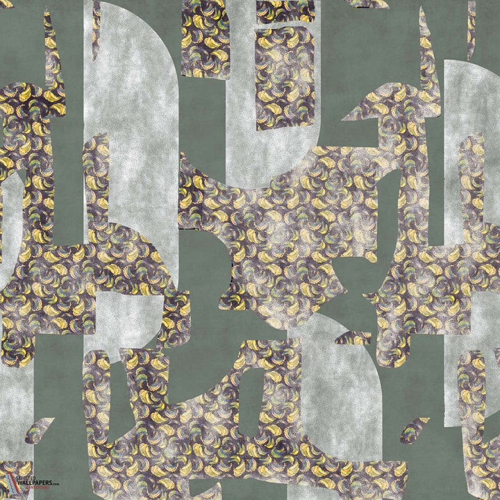 Zeffiro behang van INSTABILELAB. Dit behang op maat toont onregelmatige geometrische vormen die krachtig afsteken op een excentrieke achtergrond van geïllustreerde bananen. Behang Zeffiro INSTABILELAB Avenue behangcollectie.